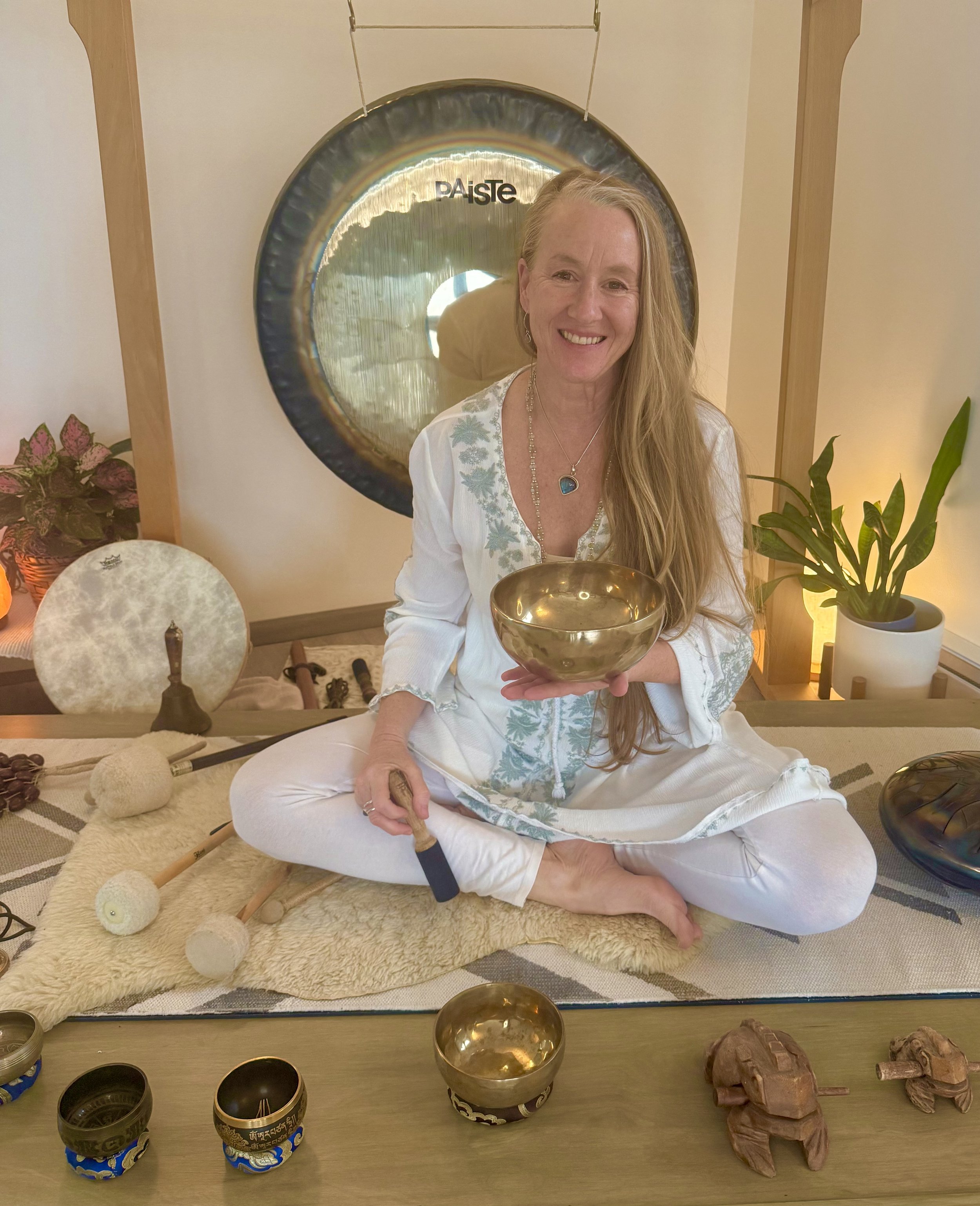 During the session, participants rest comfortably while the resonant tones of the symphonic gong and other instruments - including hand-pounded Himalayan singing bowls, voice, shamanic drum, and tongue drum — wash over and through the body, guiding them into deep relaxation. The experience is gently guided by Jessica Kerr, certified Sound Therapist and Kundalini Yoga & Meditation teacher with over a decade of experience holding space for healing and transformation through sound.